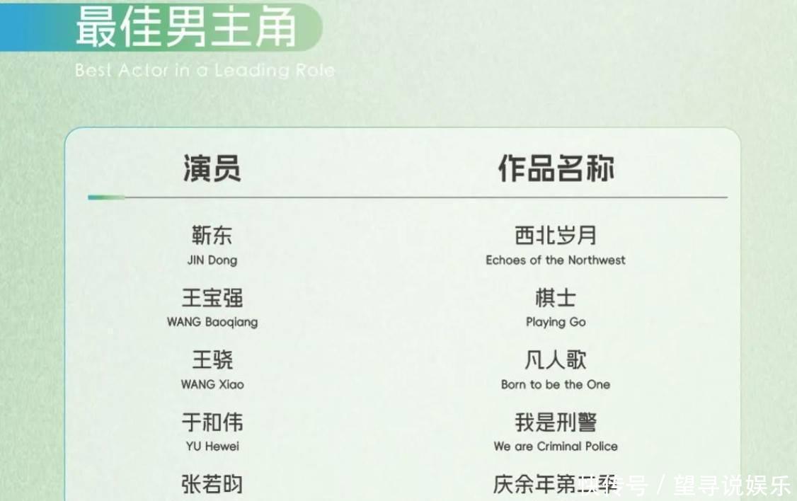 与他一同获取提名的还有靳东、王宝强、王骁和张若昀,他们区别是凭借《西北岁月》、《棋士》、《凡东谈主歌》和《庆余年2》获取的提名。