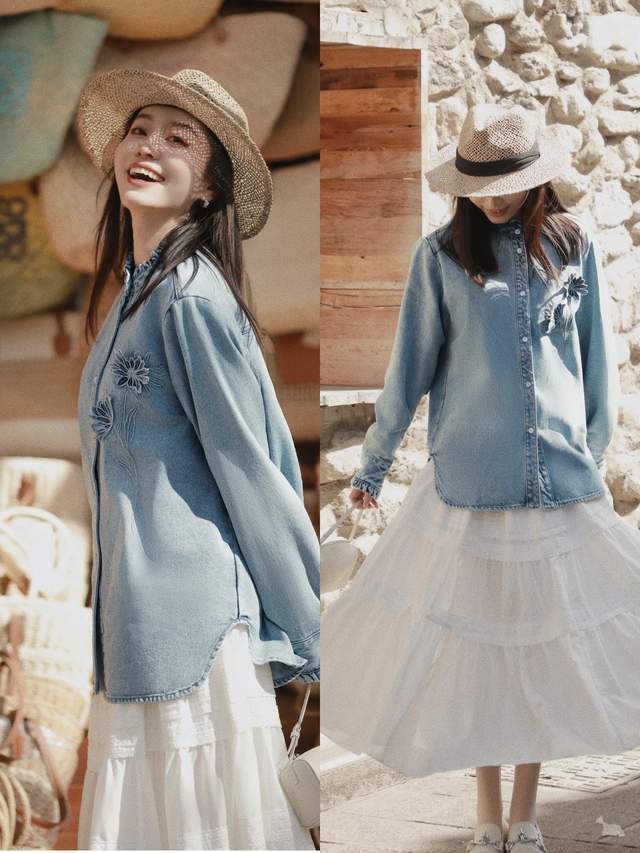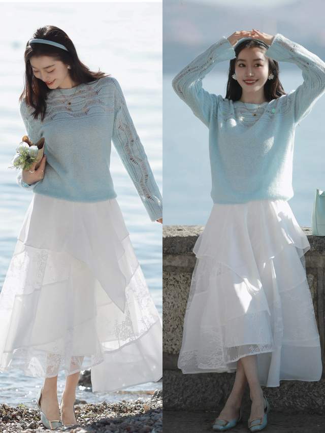 穿纯洁的白色半身裙确乎能让你看起来更有初恋氛围感。思要增多合座穿搭的少年气味,咱们不错给与一件雾霾蓝的镂空盘算真挚毛衣,来组合脚上穿的同色系的浅口单鞋,让合座配色造成颜色首尾呼应,让穿搭者青娥感扑面而来。