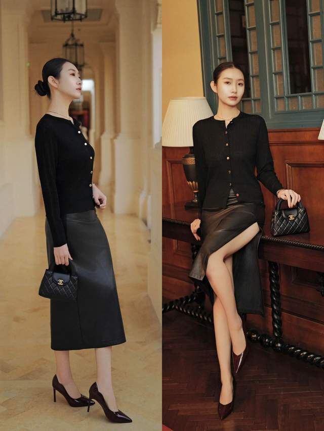 思要低调大气不张扬,用一件天生就领有和善元素的玄色真挚开衫,搭配玄色的直筒开叉半身裙,脚要穿棕红色的浅口高跟鞋,就能呈现出大女主的气质。