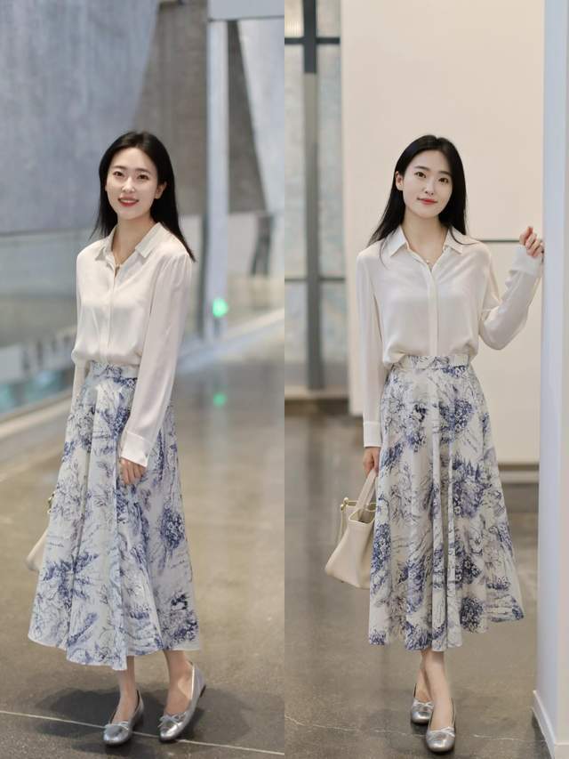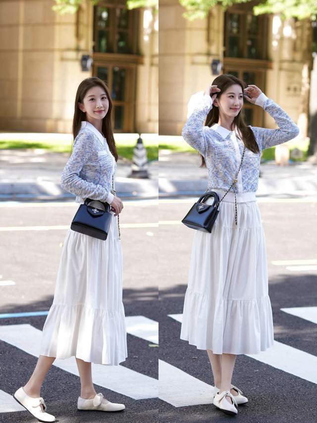 当咱们给与纯洁的白色伞状半身裙来穿搭,上衣给与一件印花的真挚开衫来组合,就能造成繁简聚集的搭配决策,这么未必措置穿衣打扮颜色过于单调问题。