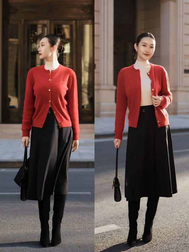 过年过节,咱们不错给与一件红色的真挚开衫,内搭白色打底衫,加上一条玄色的伞状半身裙,脚穿玄色中筒靴,玄色和红色组合经典耐看,能使得穿搭者看起来更喜庆,朝气茁壮,谁见了你齐夸你孑然真漂亮。