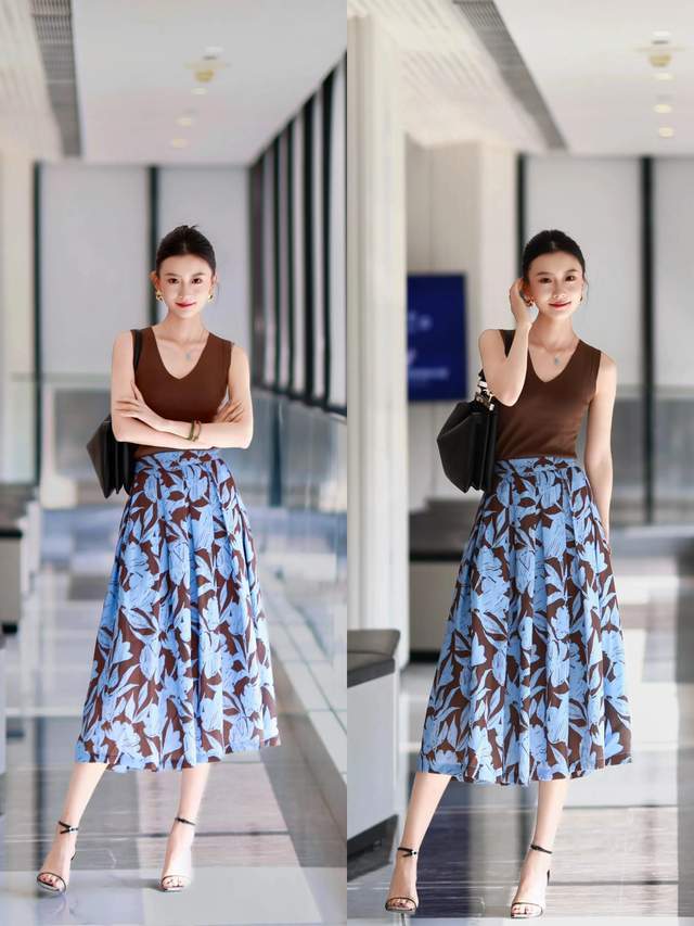 举例,上头这一条印花的伞状半身裙就作念了高腰收腰的盘算,穿的时分不错像前卫博主一样,把棕色的真挚背心衣角塞进裙子内部,就能造成高腰线,使多礼格变成三七分比例。