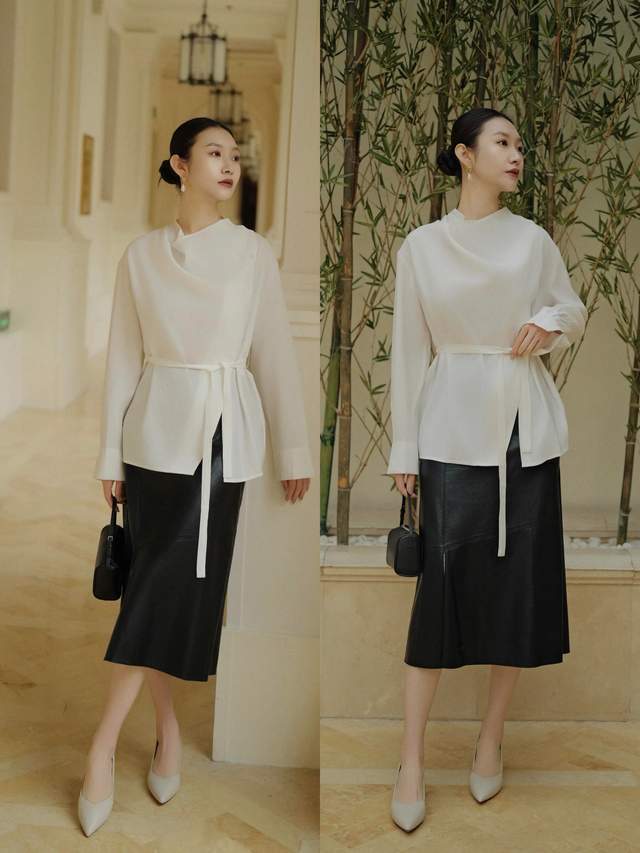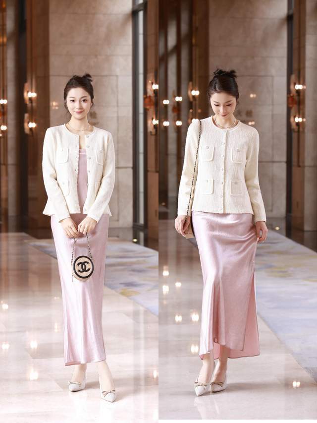 女东说念主最蹙迫的是穿得像我方,穿得不劳作。举例上头一件白色的真挚开衫,搭配上真丝面料的蕾丝边盘算直筒半身裙,脚踩一对地面色系的浅口高跟单鞋,合座打扮呈现着力就显得很“不菲”,贵妇范透顶。