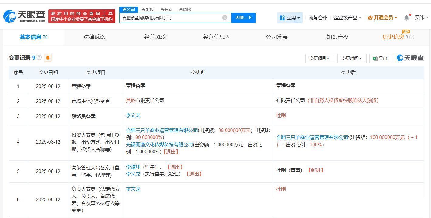 天眼查工商信息露出,近日,合肥承益收集科技有限公司发生工商变更,小杨哥门徒李文龙(网红“嘴哥”)卸任该公王法定代表东谈主、实行董事、司理,杜刚接任法定代表东谈主,并担任董事,原激动无锡丽鹿文化传媒科技有限公司退出,同期部分主要东谈主员发生变更。