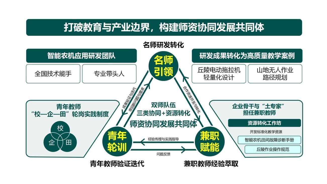 在师资成立方面,该校冲破校地企壁垒,构建“三类协同+资源转动”的师资发展共同体。由寰宇时刻高手、专科带头东说念主组建研发团队,将“丘陵电动朦胧机轻量化诡计”等恶果转动为教育案例;实施后生老师“校—企—田”轮岗机制,让研发恶果在田间获得考据迭代;引入企业主插手“土各人”共建资源转动责任坊,征战《智能农机田间故障会诊手册》等活动化资源。最终酿成“研发—教育—服务”闭环生态,确保师资军队历久紧跟产业前沿。