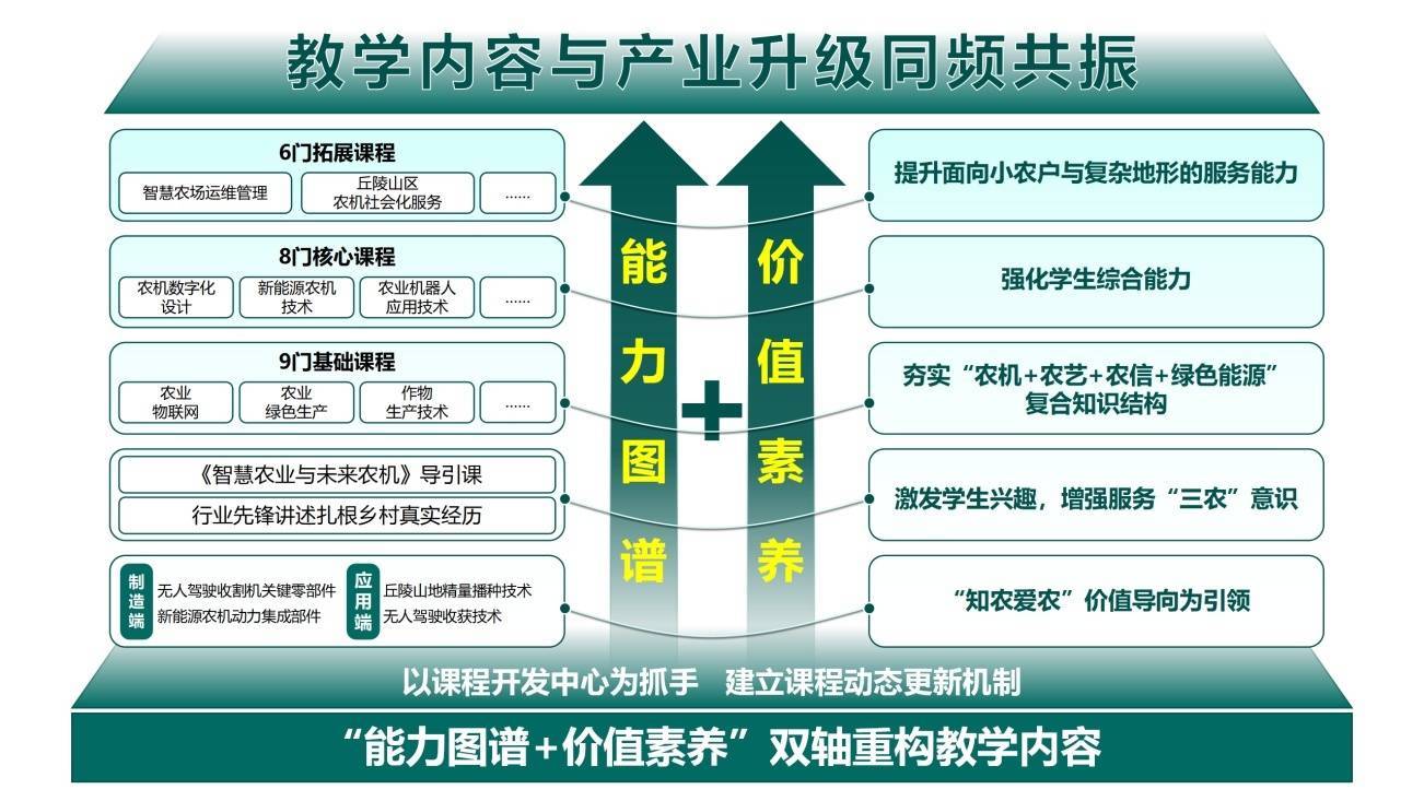 该校冲破传统学科体系局限,以“才智+素养”双轴重构课程体系,紧扣当代农机产业对“制造+诳骗”复合才智的需求,系统绘图涵盖74项才智的才智图谱,搭建“基础—中枢—拓展”三级课程结构。不仅开设《贤慧农业与往日农机》等行业前沿诱掖课,还树立《农业机器东说念主诳骗时刻》《新动力农机时刻》等8门中枢课,征战《丘陵山区农机社会化服务》等6门拓展课。同期建立课程动态疗养机制,让教育实践与产业升级历久同步共振,从泉源惩处课程与产业失配问题。